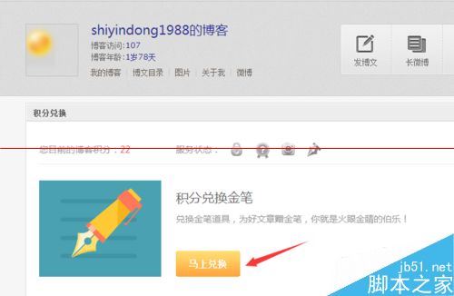 4、看到积分兑换金笔的选项,也可以看到你目前拥有的积分,点击“马上兑换”。