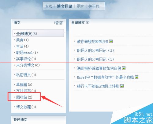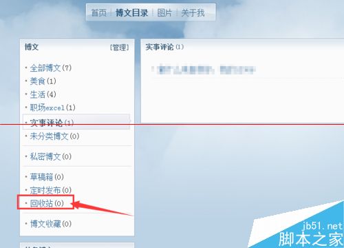 4、在博文目录的左侧你可以看到“回收站”的选项,这就是不能彻底删除的根源所在。