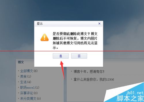 6、这时会弹出一个窗口,提示你需要彻底删除博文吗?这次删除是彻底删除,而且有关该篇博文的引用也会失效。