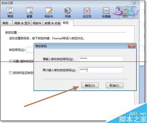 6、现在可以为锁定邮箱设置一个快捷键,将前面打勾,也可以设置启动Foxmail邮箱时需要输入锁定密码。