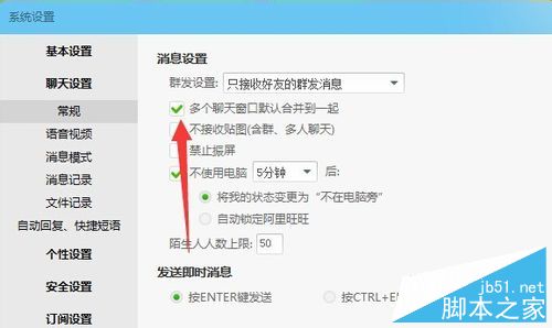 5、在聊天设置的右侧选择多个聊天窗口默认合并在一起,前面的小方框打对号。