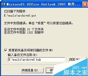5、扫描完成后出现以下窗口,点击修复。(也可在修复前进行备份)修复完成后确认,您的邮件就可以使用了。