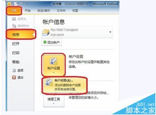1、首先启动 Outlook 2010。单击文件选项卡,然后单击信息、帐户设置、帐户设置。