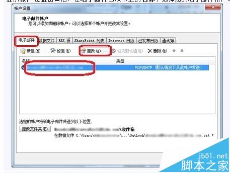 2、显示帐户设置窗口后,在电子邮件选项卡上的名称下选择您的电子邮件帐户,然后单击更改。