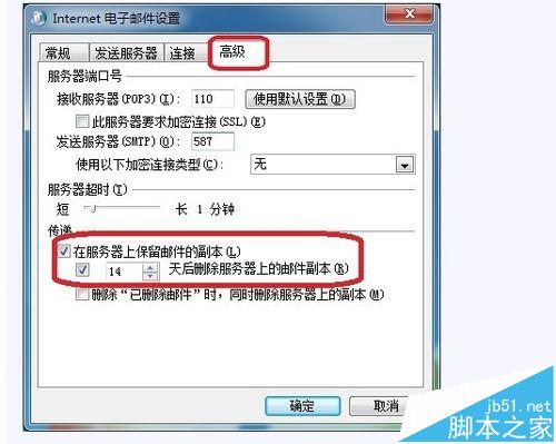 4、在高级选项卡上的传递下,应该已选中了在服务器上保留邮件副本复选框。此选项意味着邮件软件提取邮件后,邮件副本将保留在邮箱中。您是否还看到 x 天后删除服务器上的邮件副本选项?在这里您可以选择是否在指定的天数后自动从邮件服务器上删除邮件。