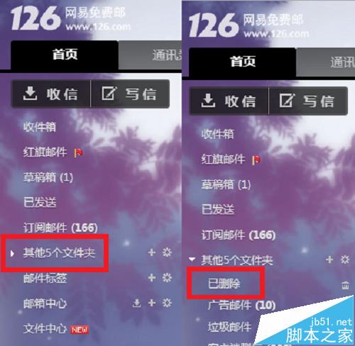 3、在登陆到邮箱页面之后,点击左侧功能栏中的“其他5个文件夹”,在它的子菜单中我们会发现“已删除”图标。