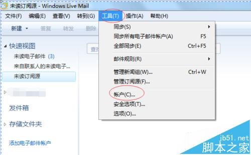 1、打开Windows Live Mail,在上方的菜单栏中找到“工具”选项并单击他,在弹出的新对话框中选择“账户”如下图中标红的位置。