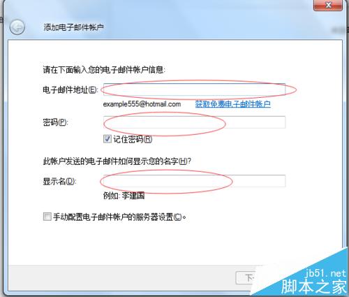5、接下来就是添加邮件地址和密码了,请填写下图中标红的信息框,注意用户名密码的正确性,显示名那一行填写的时候请注意,这是用于当对方收到你的邮件的时候显示的名称,最好能显示你自己的真名,这样对方能够一目了然就知道是谁的邮件。