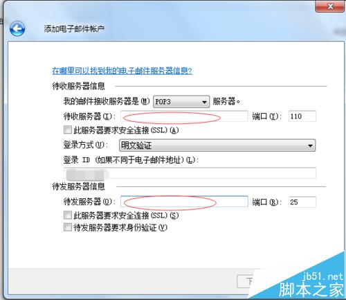 6、邮件帐号信息填写之后,点击“下一步”,页面跳转如下图,标红的位置请填写内容,代收和代发服务器请填写你的邮件服务器地址,如果不懂该地址可以咨询一下公司的网络管理员。