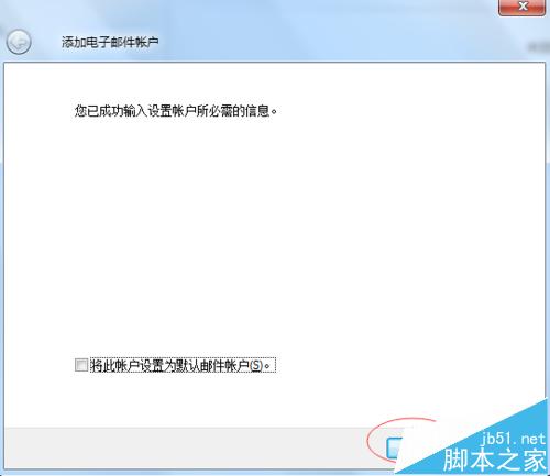 7、点击“下一步”,页面跳转如下图,点击“完成”你就完成了邮件帐号添加的功能了,这时候你就可以正常的接收该账户的邮件,或者利用该账户进行邮件发送了。