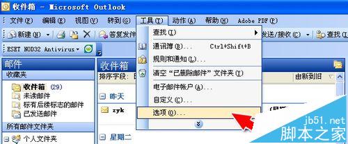 1、打开Outlook,点击“工具”——“选项”。