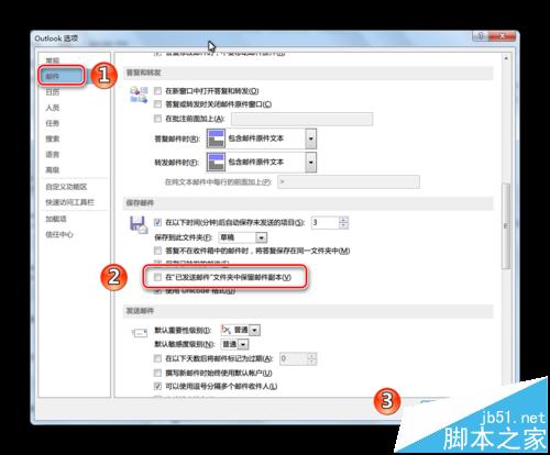 3、在选项对话框下,选择“邮件”面板,滑动到“保存邮件”选项区域,勾选掉“‘已发送邮件’文件夹中保留邮件副本”的选项,设置完毕后点击确定