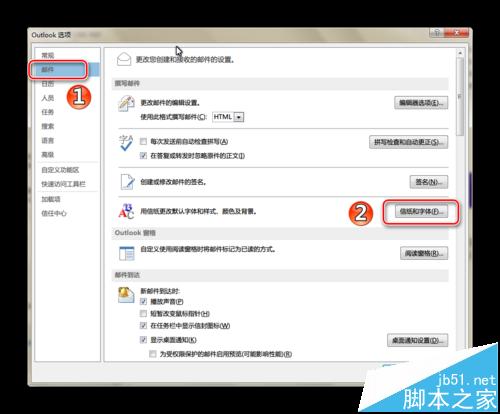 2、在打开的选项对话框中,选择邮件>信纸和字体,弹出设置对话框。