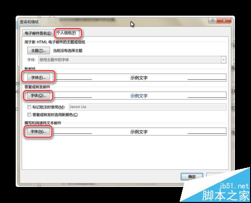 3、在弹出的对话框中,逐一设置新邮件、答复或转发邮件、撰写和阅读纯文本邮件的字体和大小即可。设置完成后,点击确定,即完成了默认字体的设置。