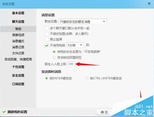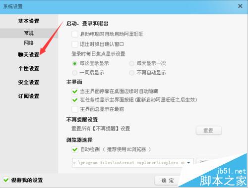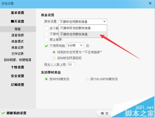 2、在系统设置窗口,在左侧主菜单栏中,点击“聊天设置”。进入聊天设置,点击常规,在群发设置里选择“不接收任何群发消息”(如下图)