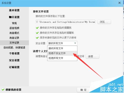 3、还是在聊天设置中,点击文件记录,在安全设置选项中选择:“拒绝不安全文件”(如下图)