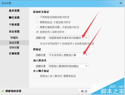 5、在安全设置-验证设置-添加好友验证,选择“拒绝任何人加我为好友”,在提醒设置选项中选择"收到添加好友请求闪动提示";群验证提醒设置选项中选择"不允许任何人把我加入群“。(如下图)