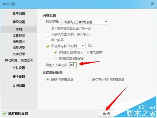 4、在系统设置窗口,在左侧主菜单栏中,点击“安全设置”。点击防骚扰,勾选“不接收陌生人消息”,勾选“启动个人聊天防骚扰”以及“启动群聊天防骚扰”(如下图)