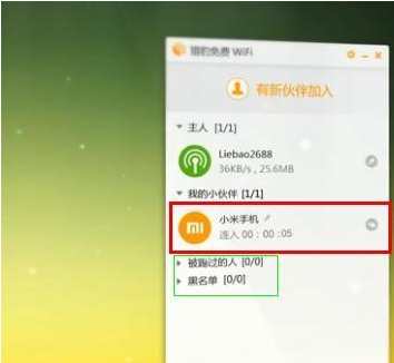 5、设置好电脑后,打开手机wifi搜索,找到自己设置的名字,然后输入密码连接,电脑会提示连接成功,有小伙伴加入,也可以管理加入的人员拉黑,踢出等,防止蹭网