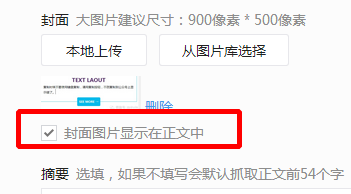 3、这时候我们在编辑的页面,我们会发现,有一个在正文显示图片的这个选项画着对勾呢,因此我们要去掉(这个就是让封面图不显示在正文的共鞥)。