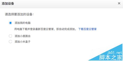 3、如果只是推送到百度云管家的下载列队中,那就可以跳过'添加设备'这个步骤,只要你是用同一个账户登陆了云管家即可。比如你在公司,你家里的电脑处于开机状态且打开了百度云管家,而且登陆账户一样