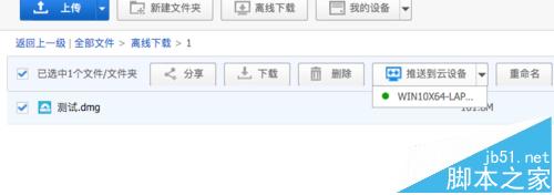 4、满足上述条件后,直接在百度云网页版中选中需要下载的资源,然后点击‘推送到云设备’按钮,它会绿灯显示你那台运行着云管家的电脑,点击电脑名称就会加入推送列队了。