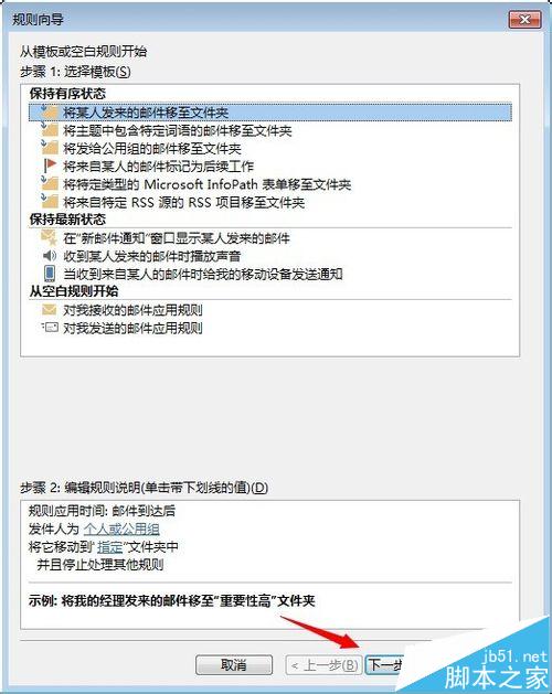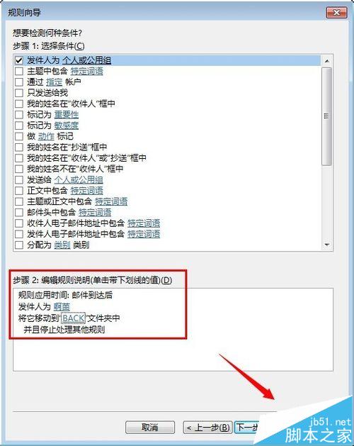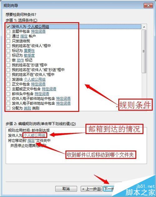 4、选择你所需要的规则条件,我一般是邮件归类用的比较多,如:XX人发过来的邮件移动到哪个文件夹。名是XX重要人发过来的邮件要标红这类的。规则说明处的带下划线处可以点击选择你所要的联系人或是文件夹。
