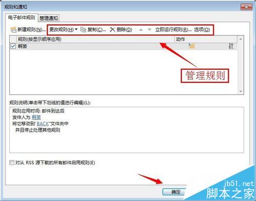 6、规则建好以后,反回到【规则和通知】对话框中,你可以更改,复制,删除,运行这些管理规则的操作。所有操作好了以后一定要记得点击【确定】