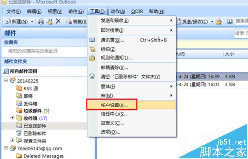 1、打开outlook 找到菜单栏---工具----账户设置,如下图位置