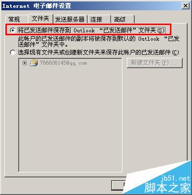 4、这下重点来了,就是这里internet电子邮件设置中“文件夹” 默认是将已发送保存到otulook 已发送文件夹