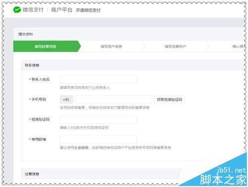 2、进入如下页面后,开始第一步信息填写工作,主要填写的内容有:联系人、手机号码、常用邮箱等信息;