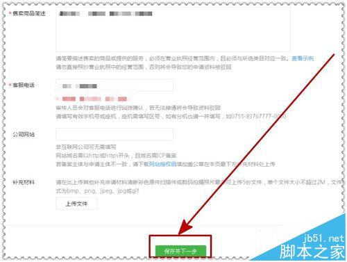 3、下拉页面,继续填写售卖商品描述和客服电话等信息,确认填写信息正确无误后,点击“保存并下一步”按钮,进入下一步操作,如下图示。