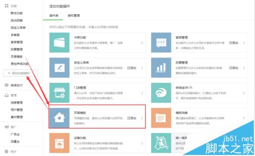 2、进入以后 ,点击右侧功能列表“页面模板”,如右侧没有则直接点击下方功能插件添加,在插件功能列表内找到“页面模板”并添加即可。