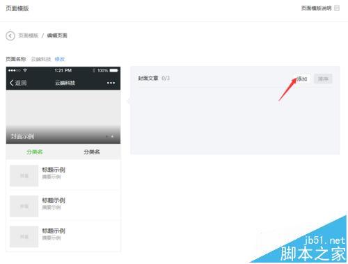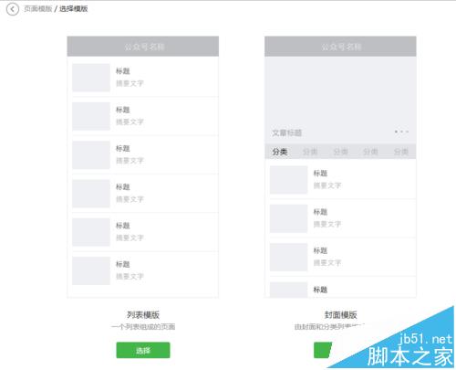 3、之后点击添加页面模板进入以下列表(如图)一共有两种展现模式如图所示和手机端展现无差异。如果要制作一个模板的话我们就要选择一个类型。例如:封面模板。出现添加界面以后如图可以自行添加已经发布的图文或编辑好微发布的图文。接下来一次类推都是同样的方法,想添加模板哪个版块的内容,就直接点击版块,然后点击添加即可。