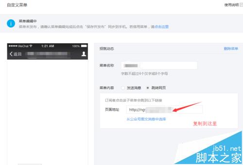 5、我们把刚才建立好的模板的链接复制下来,直接粘贴到自定义菜单即可。(如图)保存并发布菜单。