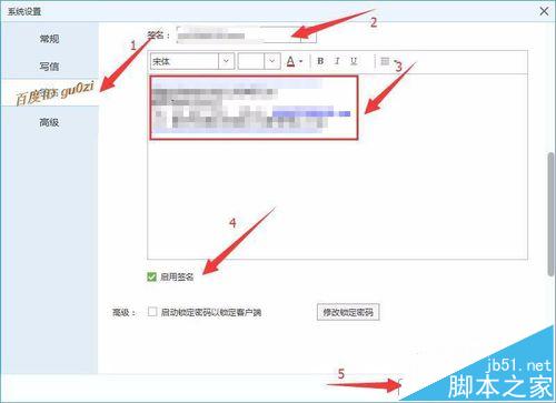 4、在这里可以对常规,写信,签名,高级等方面内容进行设置,本次的主角是签名,点击 签名,在签名处选择,要设置邮箱,在下面的内容框中,输入相应的内容,记得,一定要把启用签名,打勾.