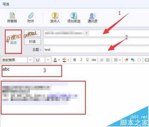 7、按顺序,填写好 收件人(为了方便测试就直接用自己的邮箱),主题,信件内容,然后点击 发送