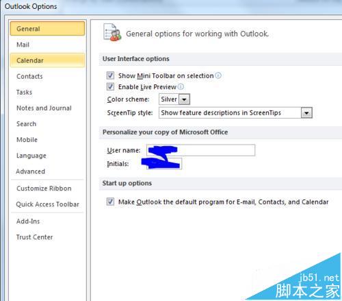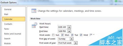 3、在打开的outlook options的左侧找到calendar选项点击