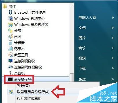 2、如果是系统问题,可以尝试重新注册动态链:开始→所有程序→附件→右键命令提示符→以管理员身份运行。