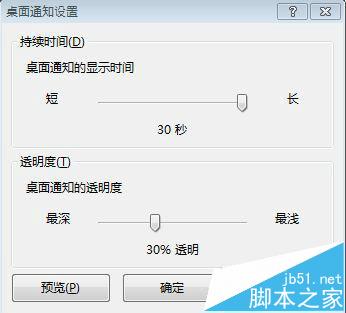 4、点击桌面通知设置,进入可以对通知显示的时间长短,透时度的设置。这个设置主要解决因为显示时间太短,透明度太小,让用户没有看到邮件提醒,而延长显示时间的作用和增加显示透明度所有。