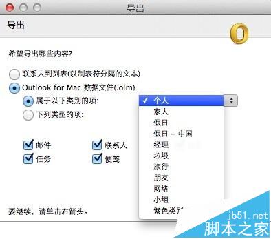 2、选择需要导出的内容。 点选『联系人到列表』;outlook for mac数据文件(.olm),点选『属于以下类别的项』:在右边的列表中选择分类;点选『下列类型的项』:勾选下面的复选框(如:邮件,联系人,日历,任务,便笺)。选择完成后,单击右下角的『右剪头』。