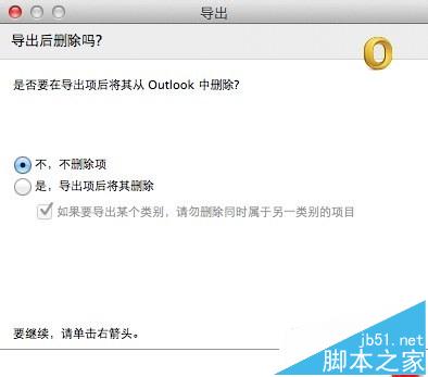 3、在询问窗口中,『导出后删除吗?』,点选『不,不删除项』;或点选『是,导出项后将其删除』;选择完成后,单击右下角的『右剪头』。