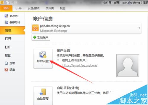 5、如果收件箱修复工具 scanpst.exe 不能修复文件,就需要使用数据文件的备份了。那怎么将备份数据文件用作新的 Outlook 数据主文件呢?打开-Outlook”文件菜单“ 选择 ”帐号设置“