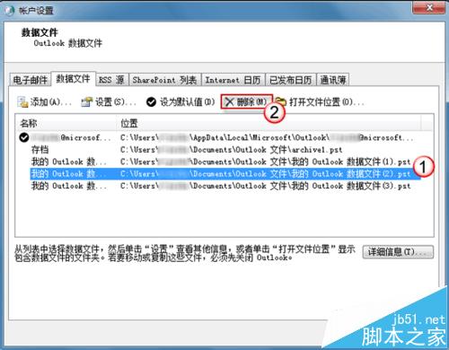 6、选择已损坏的.pst 文件,然后单击“删除”,单击“添加”,然后选择您要用作新的主文件的.pst 文件。