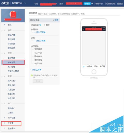 2、如果审核通过后就可以进入服务窗页面,在这个界面可以添加菜单什么,如果所示