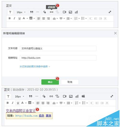 设置方法:进入微信公众平台=》管理=》素材管理=》图文消息=》单、多图文消息=》点击“超链接”图标=》输入文本内容、链接地址,及标题即可。