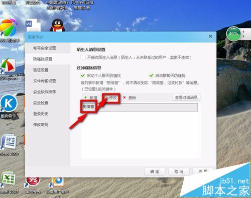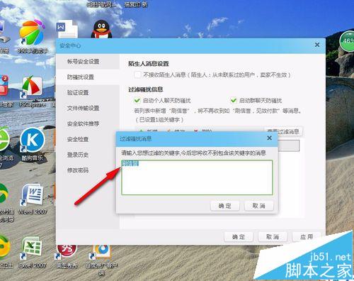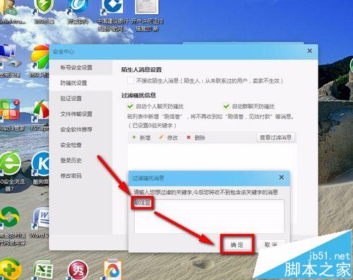 6、然后会弹出来一个对话框,我们在中间的“过滤骚扰消息”的文字框内输入我们想过滤消息的关键词,然后点击确定,如下图所示:
