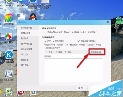 7、现在我们看到刚才设置的消息已经在过滤消息词的里面了,设置好以后我们就可以点击确定了。