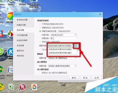 8、设置好验证问题后我们还可以看看这个页面里的其它选项,我们看到下方有“提醒设置”,里面有收到添加好友是闪动提醒还是弹出窗口提醒的方式,跟具我们的需要进行设置。