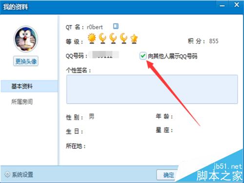4、然后弹出一个个人资料设置页面,把【向其他人展示QQ号码】前面的钩钩去掉。